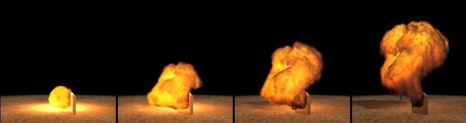 The Figure shows a cross-section of pressures for a three-dimensional explosion near a wall. The initial disturbance in the rst image interacts with the surrounding fluid and causes a pressure wave to propagate through the medium. In the second image, the blast wave has shocked up, as is evident by the large differences in pressure across the shock front. The blast wave reflects of the wall and the ground in the third image. In the fourth, the wave that reflected of the ground merges with the initial blast wave to form a Mach stem, which has pressure values twice that of the initial wave. In the final two images, the blast wave crests over the wall and forms a weaker diffracted wave.